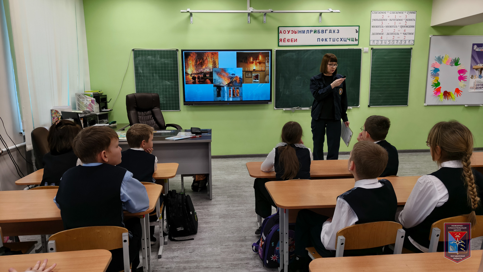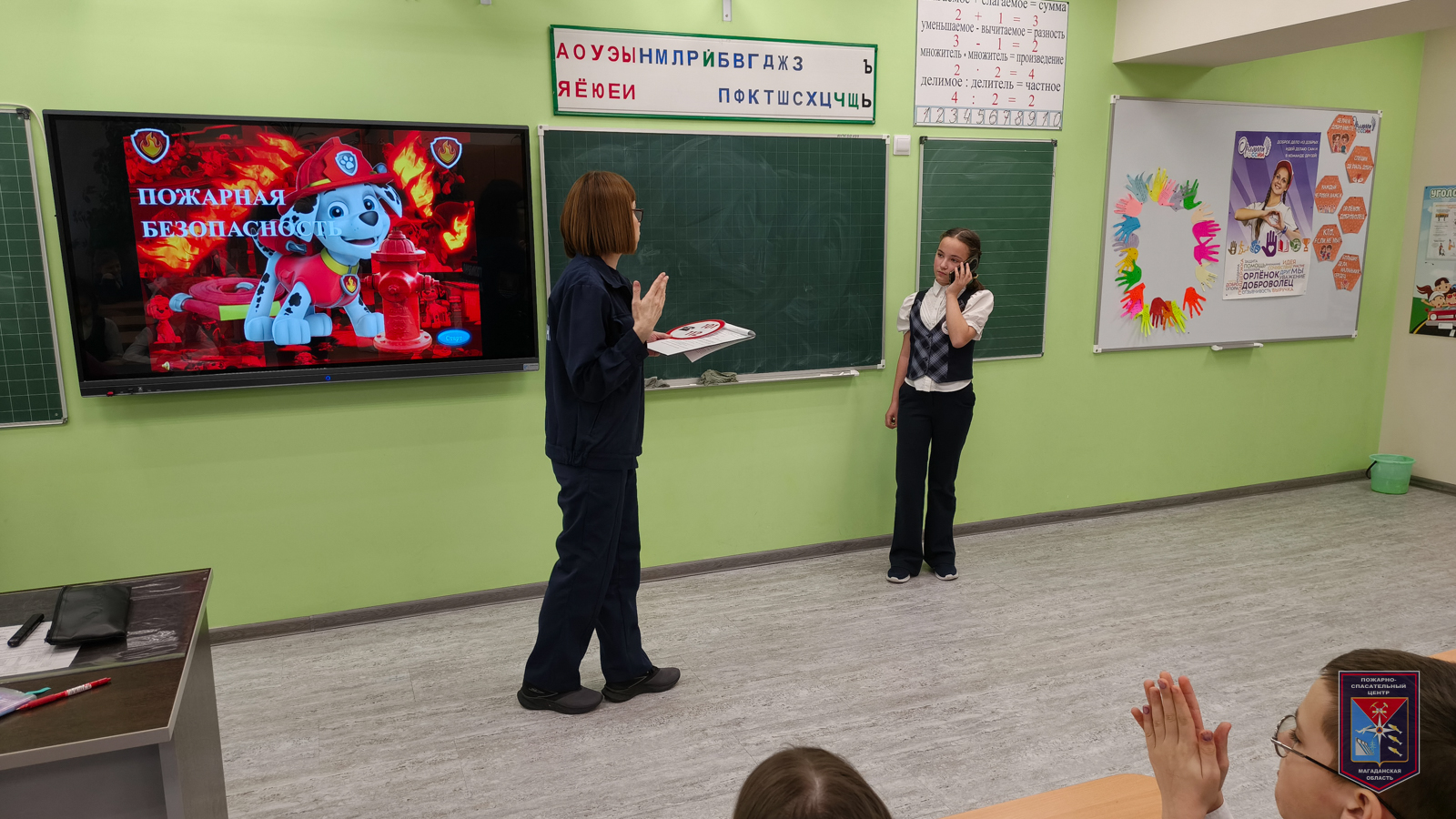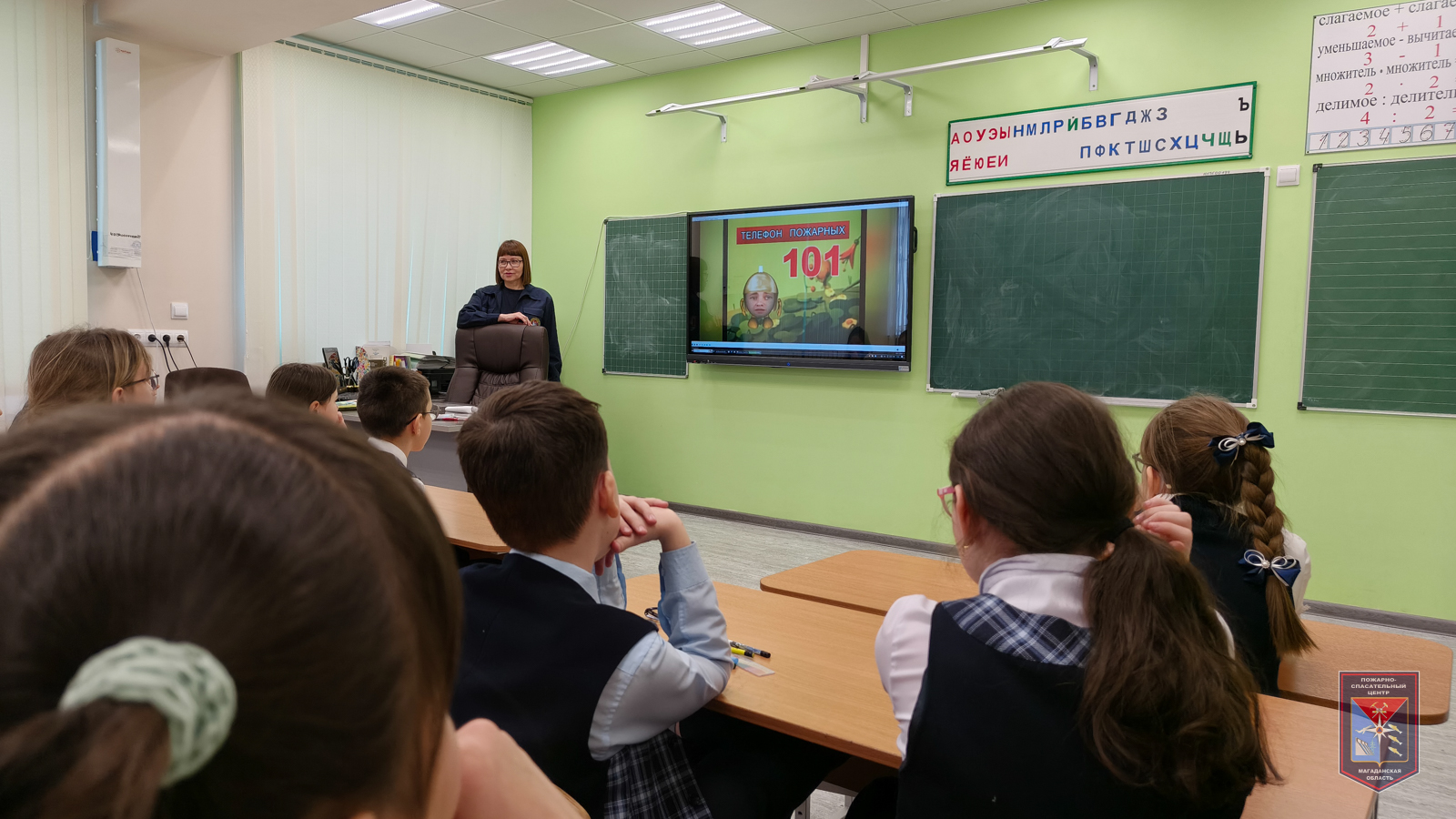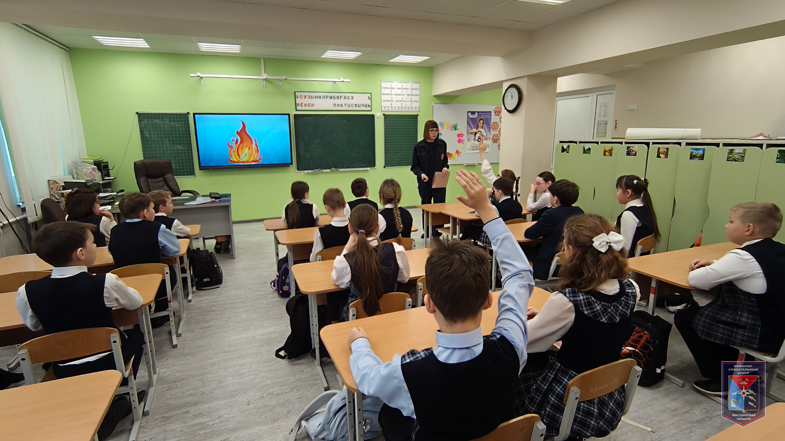 Для большей наглядности ребятам был представлен обучающий фильм «Пожарный Колобок 101 о правильных действиях при возникновении пожара в здании школы или дома». После просмотра ребятами была рассмотрена ситуация, когда пожар происходит дома. Школьники предлагали свои варианты действий, а ведущий специалист Пожарно-спасательного центра Эльвира Канчалан корректировала ответы ребят.