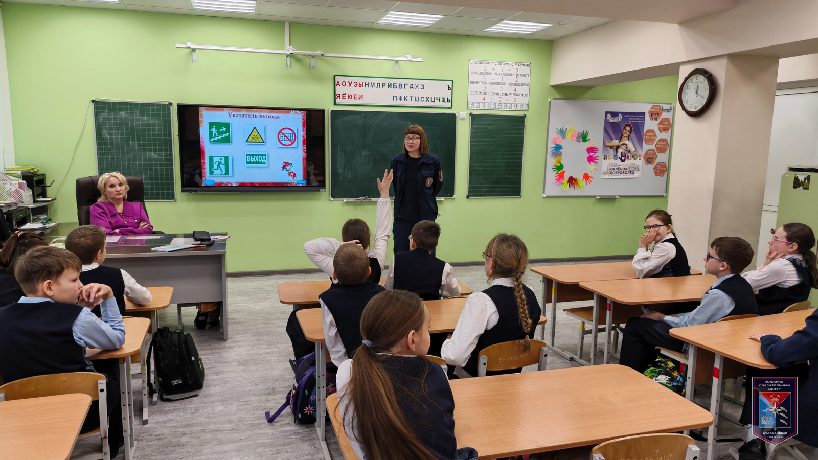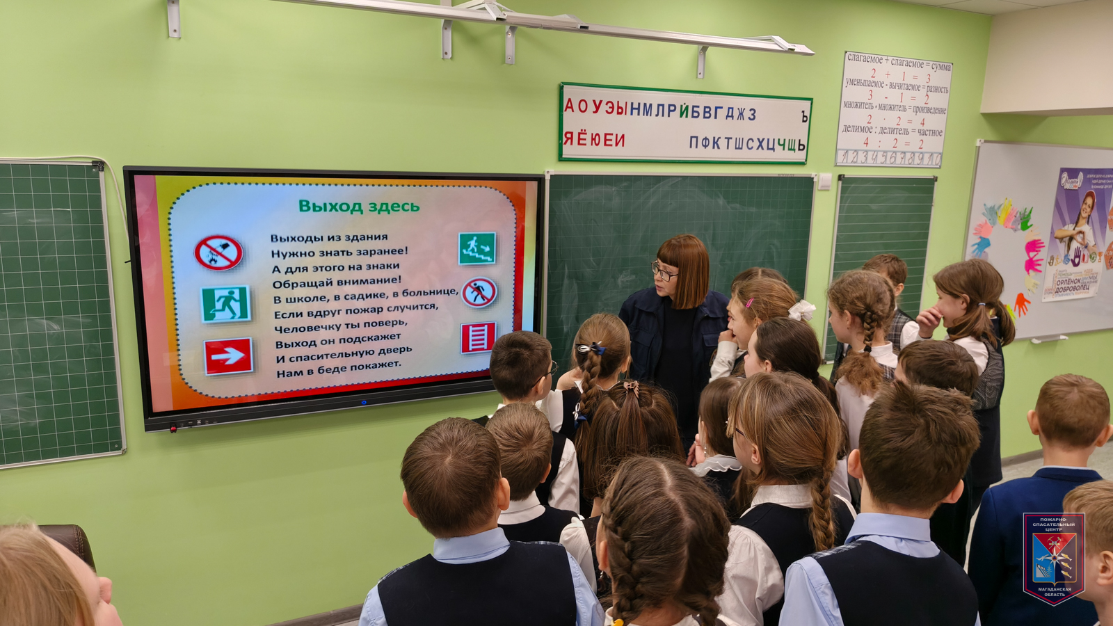 В условиях, когда пожар уже невозможно предотвратить, необходимо правильно эвакуироваться и сообщить о возгорании пожарным. Этому учащиеся учились во второй части занятия. Сперва ребята ознакомились с планом эвакуации, разобрав важные правила – построиться, не толкаться, сохранять спокойствие, слушать своего учителя, закрыть лицо от дыма и двигаться в безопасное место по плану эвакуации здания. На плане всегда указаны различные эвакуационные знаки и другие условные обозначения, которые помогают безопасно покинуть здание или какое-либо помещение в случае чрезвычайной ситуации. С этими знаками также познакомились четвероклассники.